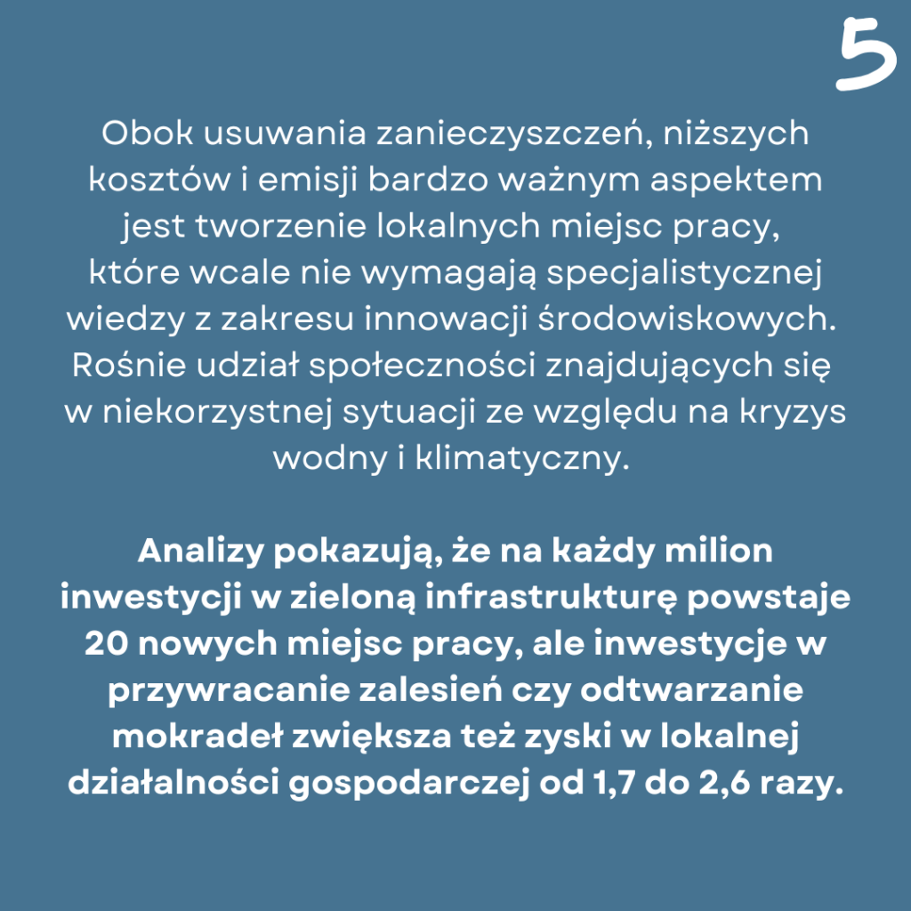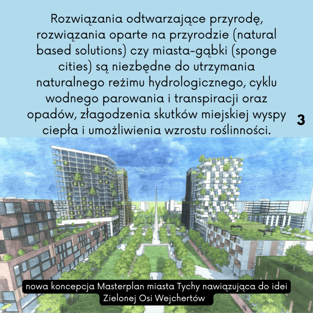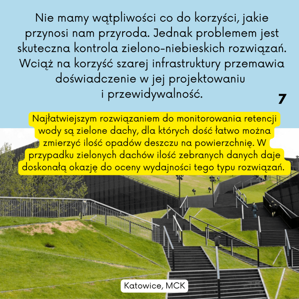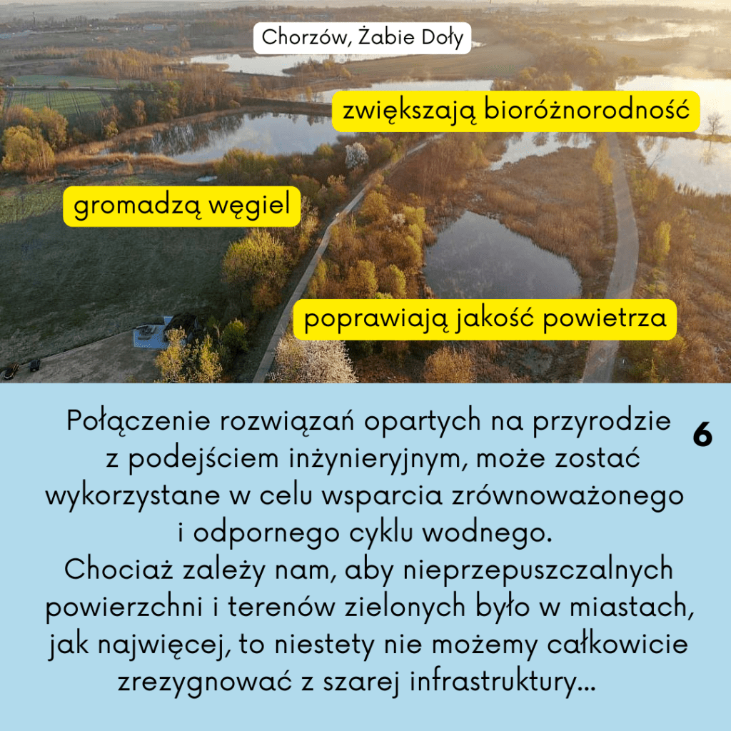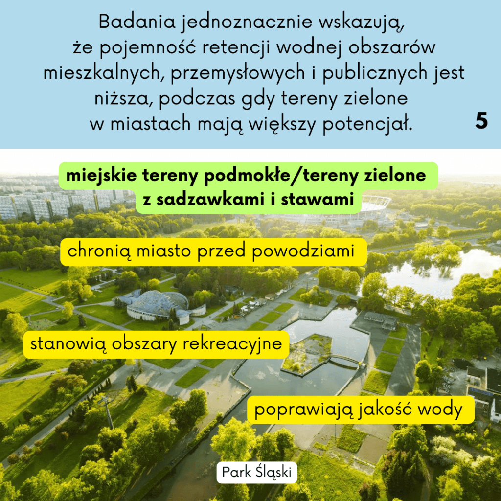➡️ Niestety nie jesteśmy w stanie zrezygnować z wielu rozwiązań hydrotechnicznych w mieście, ze względu na gęstą zabudowę i dużą liczbę mieszkańców, ale musimy dążyć do wdrażania rozwiązań opartych na przyrodzie tam, gdzie tylko jest to możliwe, ponieważ to one są w stanie skutecznie wspierać miejskie stosunki wodne i łagodzić klimat.