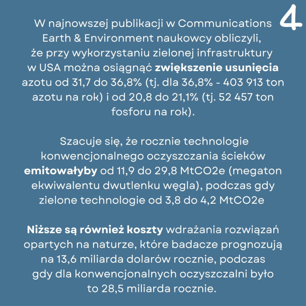 Choć rozwiązaniami opartymi na przyrodzie można usunąć mniej niż 40% azotu i 25% fosforu produkowanych ze ściekami w USA, to nadal są to bardzo obiecujące dane, które możemy wykorzystać, jako argument we wdrażaniu tego typu rozwiązań w Europie💚