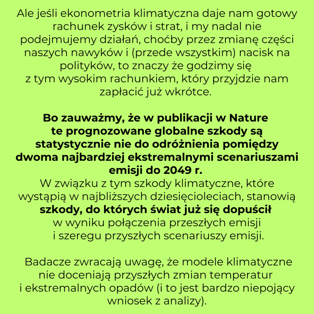 17 kwietnia 2024 r, ukazała się, jak dotychczas najszersza analiza rachunku, który zapłacimy za niepodejmowanie działań na rzecz łagodzenia i adaptacji klimatycznej 👇Szacunki jasno pokazują, że NIE podejmowanie działań będzie miało dużo wyższe koszty, niż wdrożenie polityk klimatycznych i ograniczenie emisji…