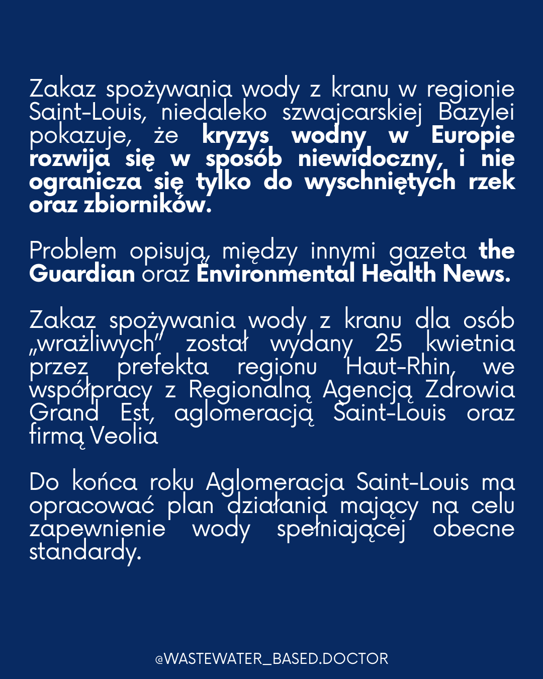 Rok 2025 – rok, w którym zaczął się w Europie kryzys wodny? Opublikowane przezEdyta Łaskawiec9 marca, 20268 stycznia, 2026Opublikowany wUncategorizedTagi:europa, kryzyswodny, woda, zasobywodne, zdrowie Źródła: Artykuły prasowe: https://www.theguardian.com/environment/2025/jul/01/pfas-forever-chemicals-water-contamination-saint-louis-france-aoehttps://www.ehn.org/france-s-largest-tap-water-ban-exposes-widespread-pfas-pollution-risk-across-europeZanieczyszczenie PFAS w europejskich zasobach:https://www.eea.europa.eu/en/analysis/publications/pfas-pollution-in-european-watersForever Pollution Project:https://www.lemonde.fr/en/les-decodeurs/article/2023/02/23/forever-pollution-explore-the-map-of-europe-s-pfas-contamination_6016905_8.htmlPFAS Contamination in Europe: Generating Knowledge and Mapping Known and Likely Contamination with “Expert-Reviewed” Journalism: https://pubs.acs.org/doi/10.1021/acs.est.3c09746 Udostępnij: Udostępnij na X (Otwiera się w nowym oknie) X Udostępnij w serwisie Facebook (Otwiera się w nowym oknie) Facebook Lubię Wczytywanie… Powiązane